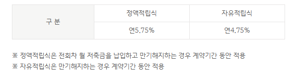 ※ 자유적립식 : 매월(1일~말일) 자유롭게 저축 (만기 1개월 전까지 저축 가능)