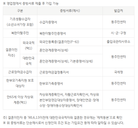 ●기초생활수급자(소년소녀가장 포함), 북한이탈주민, 결혼이민자, 근로장려금수급자, 한부모가족지원 보호대상자, 만65세 이상 차상위계층